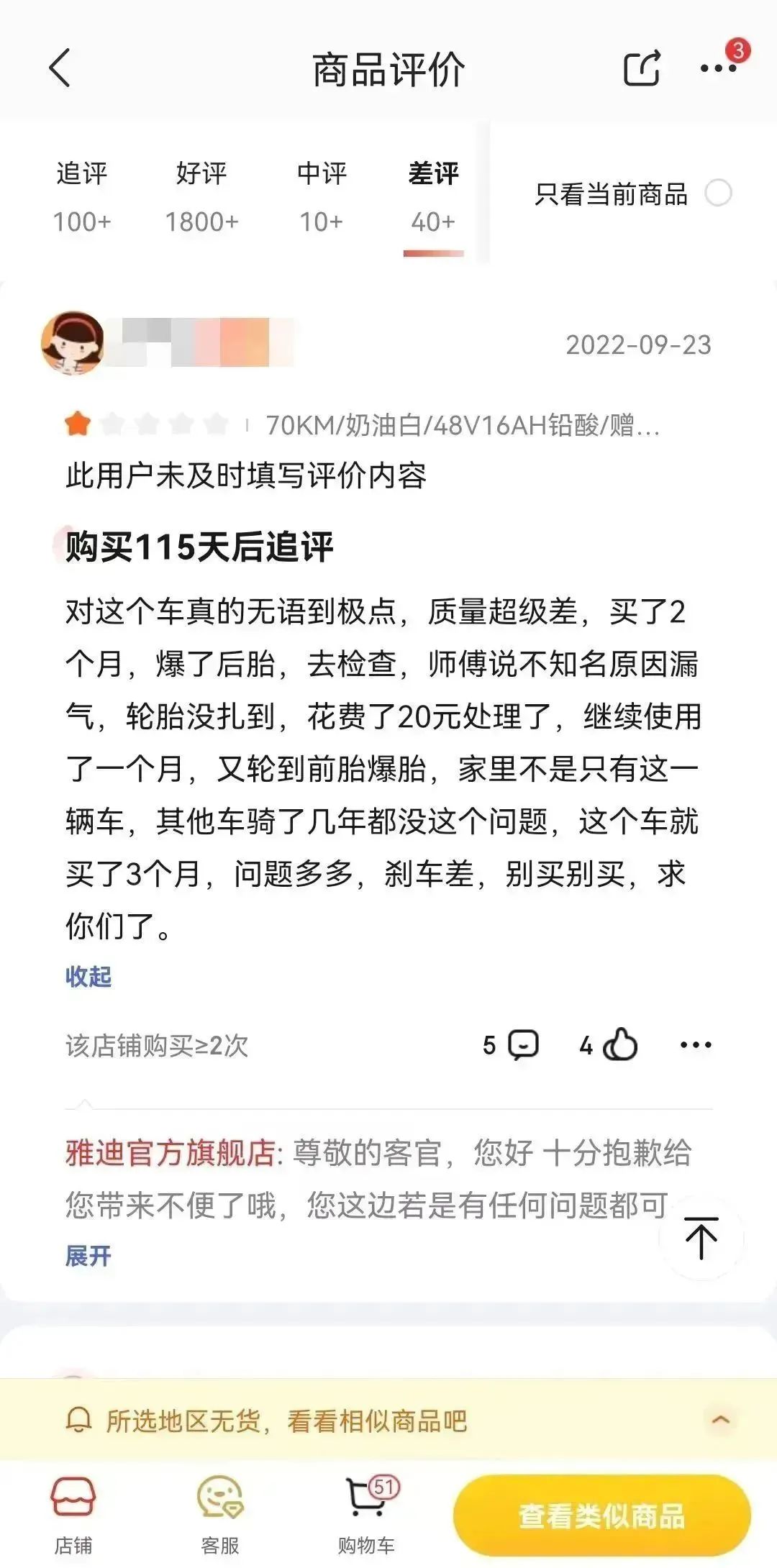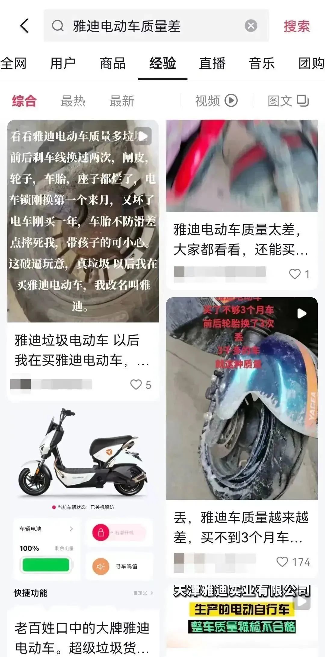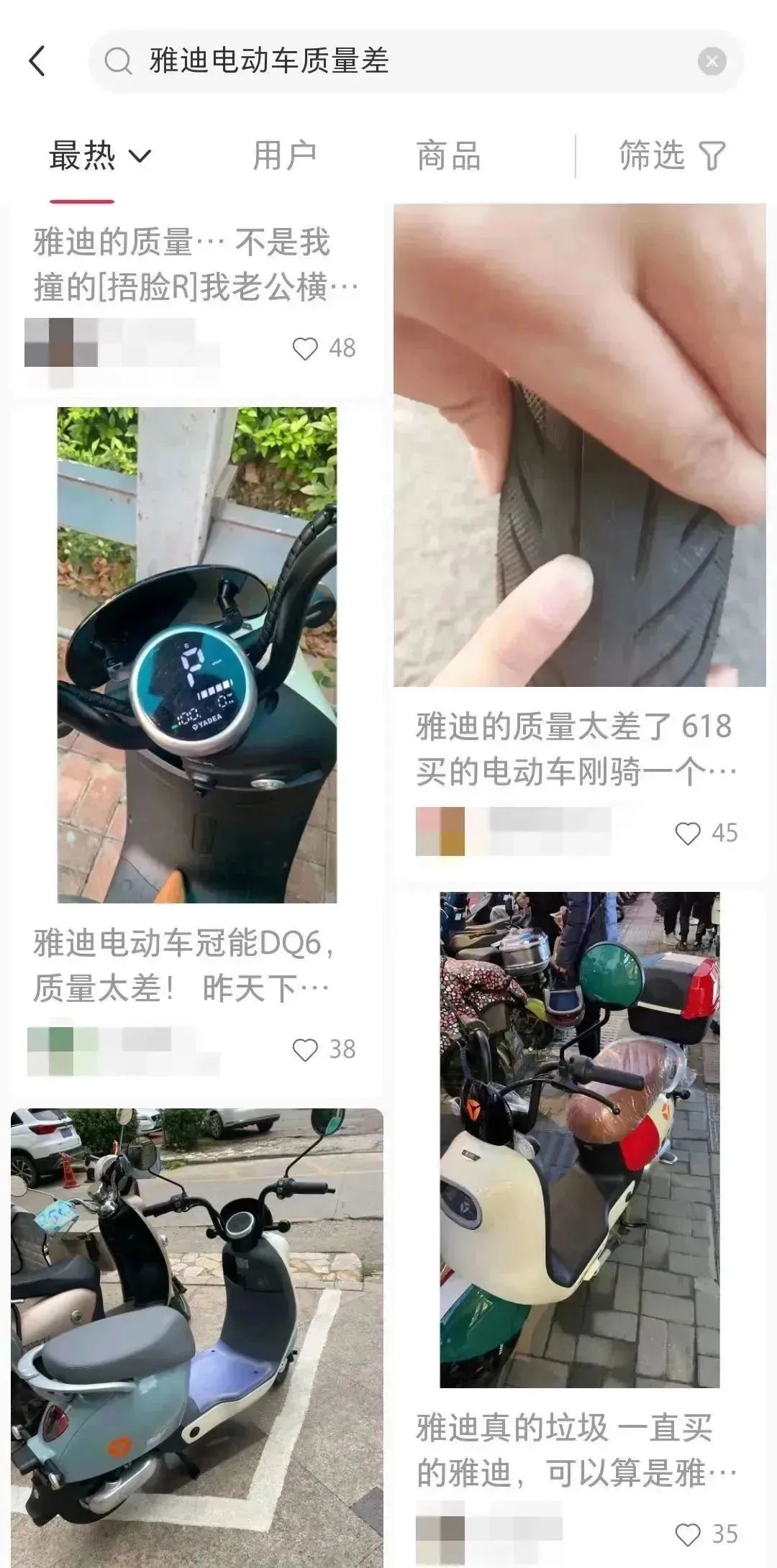 无论是在抖音、小红书等社交平台,还是在天猫、京东等电商平台,抑或是在黑猫投诉等投诉平台上,都能看到关于雅迪产品质量问题的投诉。
