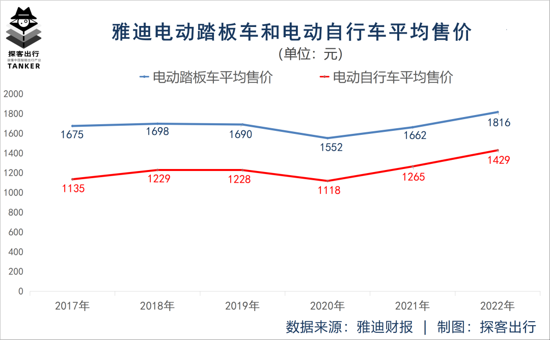 再看电动车平均售价。根据雅迪往期财报,在过去的6个年度(2017年-2022年)里,电动踏板车平均售价分别为1675元、1698元、1690元、1552元、1662元和1816元;电动自行车平均售价分别为1135元、1229元、1228元、1118元、1265元和1429元。