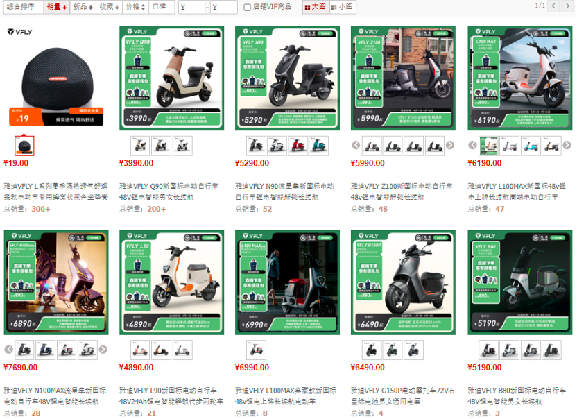 此外,雅迪高端电动车在电商平台的销量表现也可反映出其“冲高”不利。以VFLY为例,作为雅迪高端子品牌,其推出至今已有1年零9个月之久,但VFLY天猫旗舰店上的销量堪称有些惨淡。