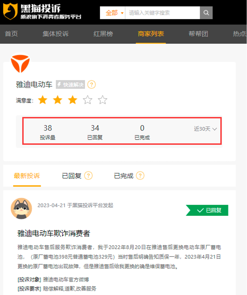 而且,雅迪对于消费者们的投诉似乎不够重视。「探客出行」在黑猫投诉平台上发现,近30天关于雅迪的投诉达38起,平均每天至少被投诉一次,完成率却为0。