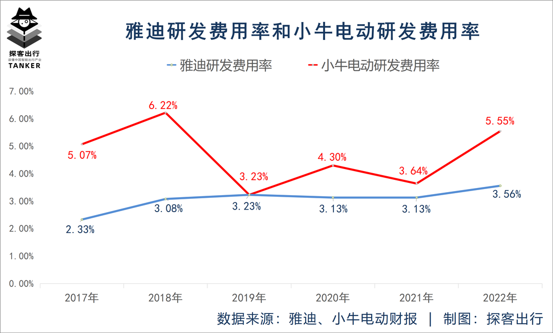 「探客出行」仔细梳理了雅迪和小牛电动两家企业的财报,发现在过去的6个年度(2017年-2022年)里,除了2019年,两家公司的研发费用率相同,均为3.23%,其他年度雅迪的这一数值均在小牛电动之下,最大差距出现在2018年,达到3.14%,最小差距发生在2021年,为0.51%。