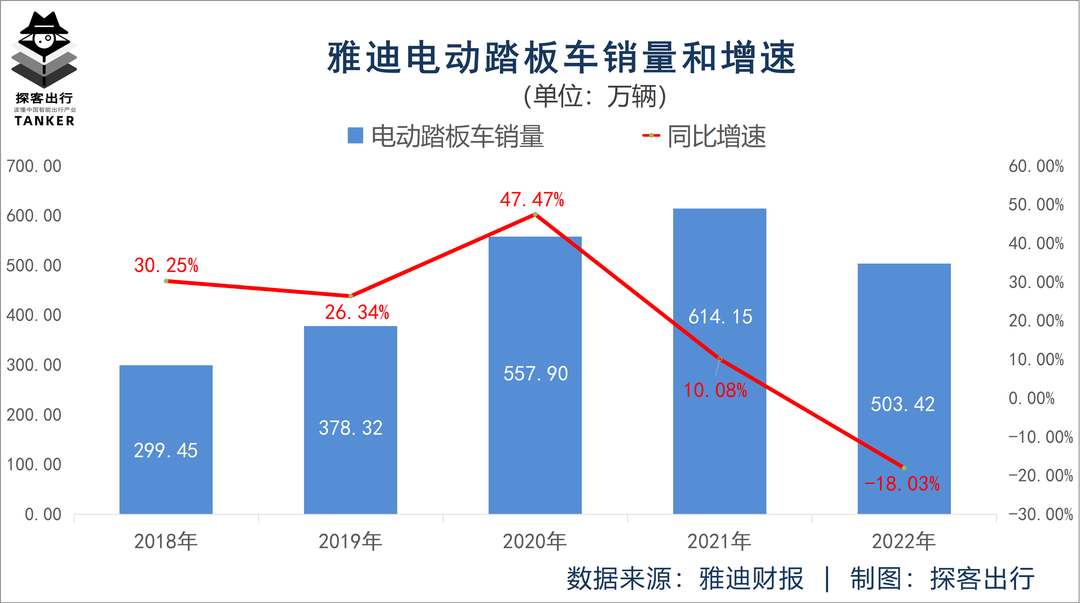 此外,雅迪的电动踏板车销量也在下滑。财报显示,2022年雅迪的电动踏板车销量为503.42万辆,较上年同期的614.15万辆下降18.03%。需知,这是雅迪2018年以来首次出现销量下滑。