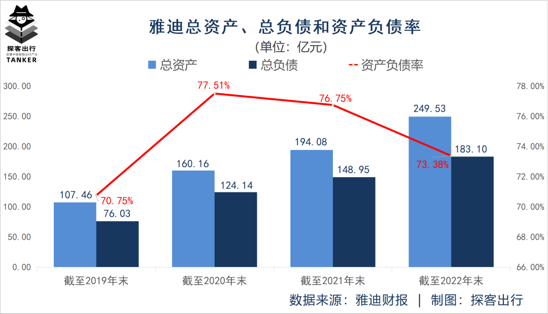 资产负债率长期偏高也是一个大问题,财报显示,在过去的4个年度(2019年-2021年)里,雅迪的平均资产负债率高达74.60%,远超公认的资产负债率适宜水平(40%-60%)。