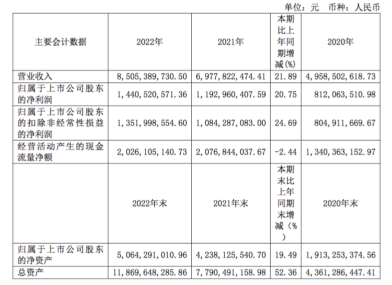 财报显示,东鹏饮料在2022年的营业收入是85.05亿元,上年同期是69.778亿元,同比增长21.89%;归属于上市公司股东的净利润14.41亿元,上年同期为11.93亿元,同比增长20.75%;归属于上市公司股东的扣除非经常性损益的净利润为13.52亿元,上年同期为10.843亿元,同比增长24.69%。