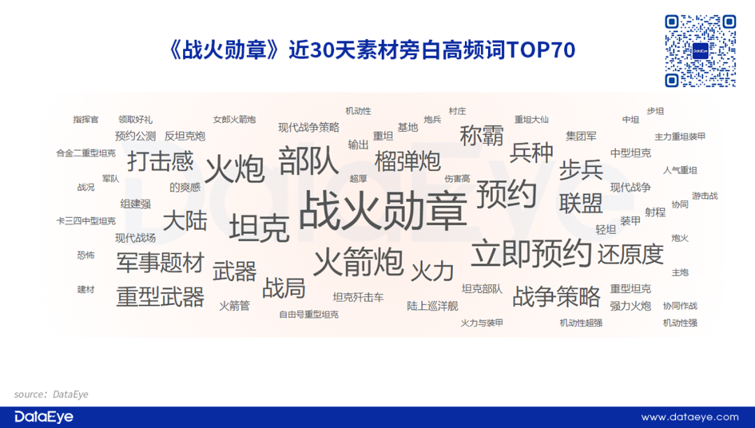 具体到效果广告素材上,根据DataEye-Tidea显示:“榴弹炮”“火箭炮”“坦克”等元素是近30天素材旁白出现的高频词,而“军事题材”“战争策略”等产品相关内容关键词也不少。