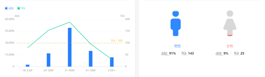 最近一周,《战火勋章》在今日头条搜索用户中,31-40岁年龄层用户占比最高,接近50%。而在性别分布方面,男性玩家占比高达91%。