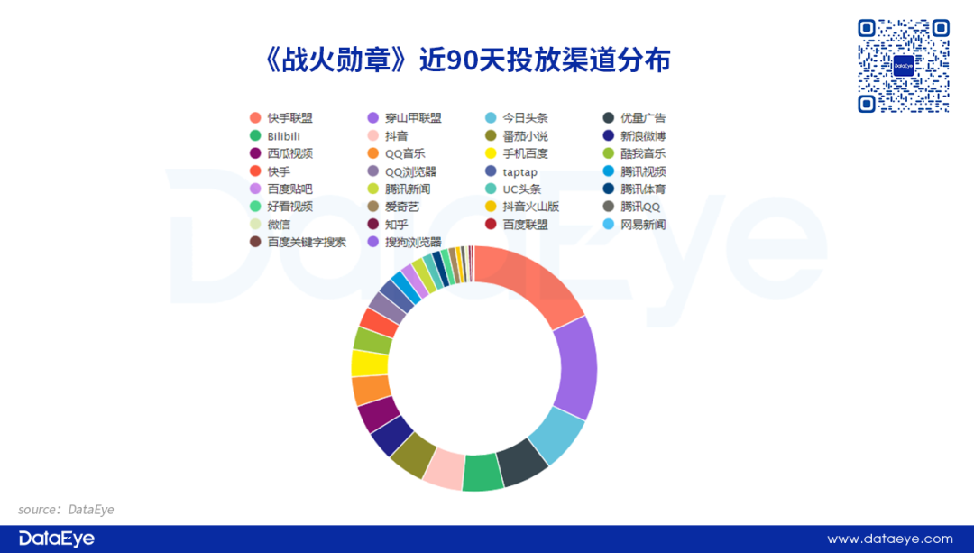 DataEye-ADX投放数据显示,《战火勋章》投放渠道分布较广,2023年至今投放了约31个媒体渠道。另外,投放渠道TOP10中,字节系渠道占了5个。