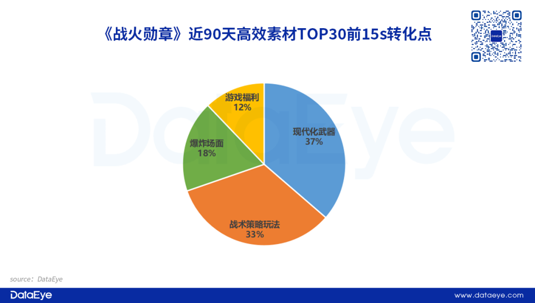 在转化点方面,《战火勋章》的高效TOP30视频素材中,“现代化武器”和“战术策略玩法”占比较高,符合降低门槛和好奇尝试的创意原则,其次素材也会突出“爆炸场面”和“游戏福利”。