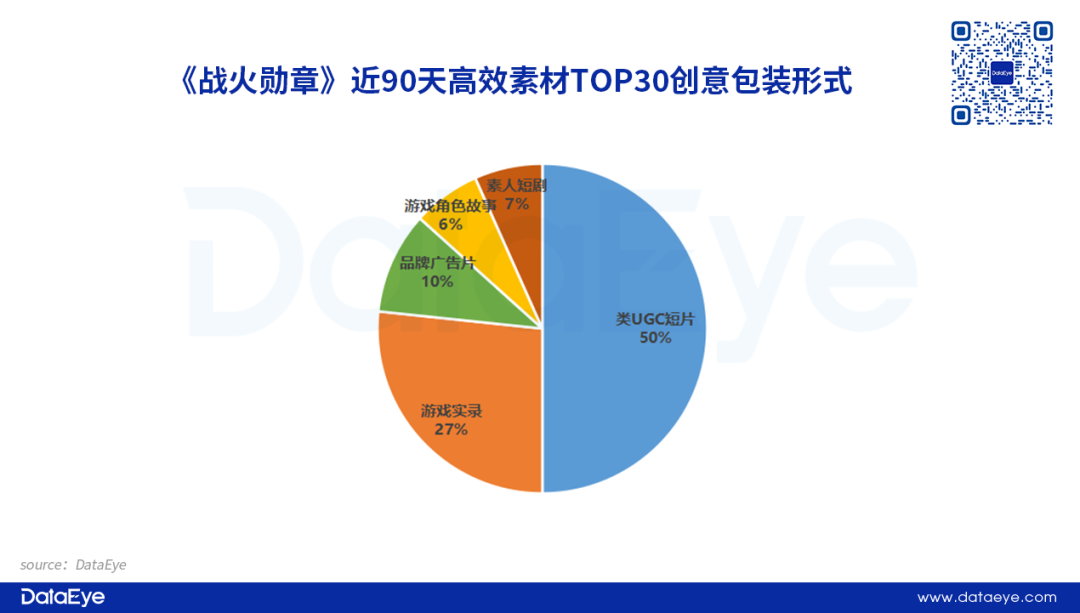 《战火勋章》近30天高效素材的创意包装形式以“类UGC短片”为主,占比约为50%。其次是展现游戏内容画面的“游戏实录”。另外,项目组也会以品牌广告片、游戏角色故事以及素人短剧的方式包装素材,但占比不高。