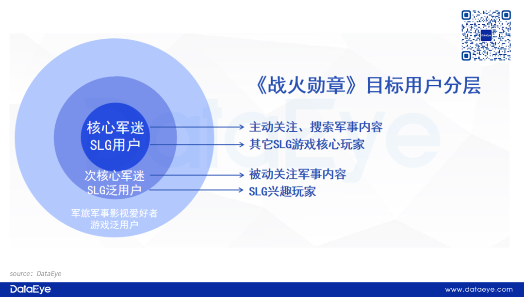 第二,DataEye研究院的观察。《战火勋章》上线主攻:1、题材向的军迷用户,其中①核心军迷、②纯爱好者,是最核心的目标。(“先题材,后玩法;先军迷,后SLG”)