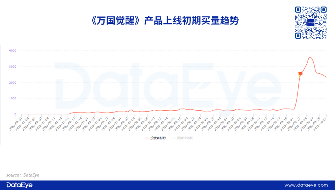 事实上,莉莉丝的《万国觉醒》在产品上线阶段也是如此。产品上线前大约90天就保持稳定且逐渐提升的投放策略,直到产品上线当天投放素材量才飙升。