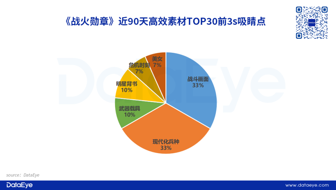 DataEye研究院梳理了《战火勋章》近30天高效视频素材TOP30前三秒吸睛点。数据显示,“战斗画面”和“现代化兵种”占比较高,其次则是通过武器载具和战争剧演员吸引题材玩家。