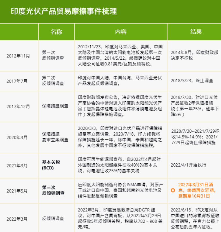 印度是继中国和美国之外唯一的10GW级以上的光伏市场,光照资源丰富,但长期以来一直依赖严重依赖进口。近年来,印度政府出台一系列政策,刺激本国光伏制造业发展,贸易保护也成为重要手段。