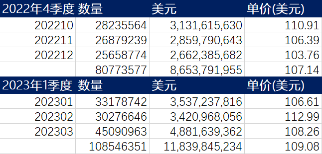 另外,去年第四季度三项产品出口合计为114.45亿美元。这样算,今年一季度较上一季度,环比增长27.46%!