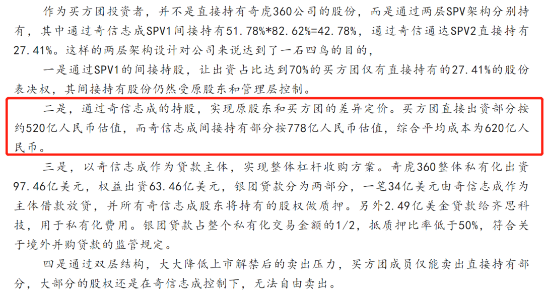 网友“远山淡影江南雨”自称是参与方的一员,据其透露,投资人通过奇信志成间接持有部分按778亿人民币估值,如果按照这个数据计算,奇信志成入股成本约359亿元。即使算上买方团直接出资部分,按平均成本620亿元计算,奇信志成入股成本也有近290亿元。而在360股价最低点时,奇信志成持股市值只剩200亿元出头。