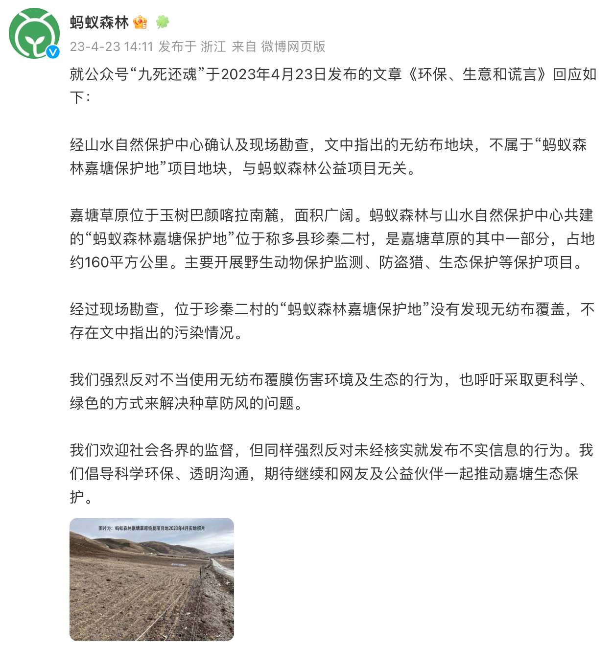 4月23日,公众号“九死还魂”发布文章《环保、生意和谎言》称,蚂蚁森林环保项目涉嫌大规模污染自然保护区,文章指出,青海玉树嘉塘草原出现大量绿色塑料薄膜,正在碎解中,污染面积大于634个标准篮球场的面积。对此,@蚂蚁森林 发文回应:经山水自然保护中心确认及现场勘查,文中指出的无纺布地块,不属于“蚂蚁森林嘉塘保护地”项目地块,与蚂蚁森林公益项目无关。经过现场勘查,位于珍秦二村的“蚂蚁森林嘉塘保护地”没有发现无纺布覆盖,不存在文中指出的污染情况。