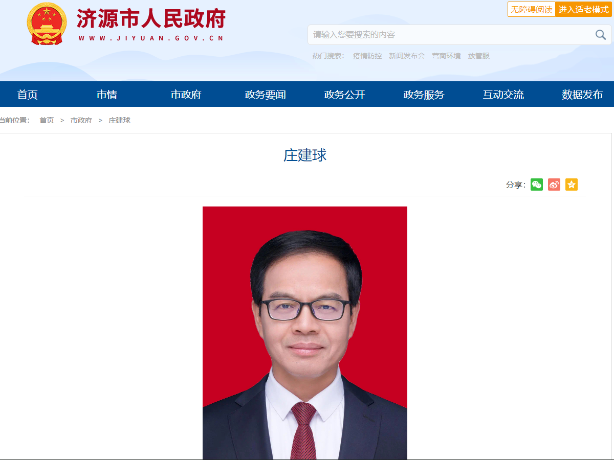 据济源日报报道,4月23日,济源召开领导干部会议,宣布省委决定:庄建球同志任济源产城融合示范区党工委书记,中共济源市委书记。省委组织部李颖波同志出席会议并讲话。