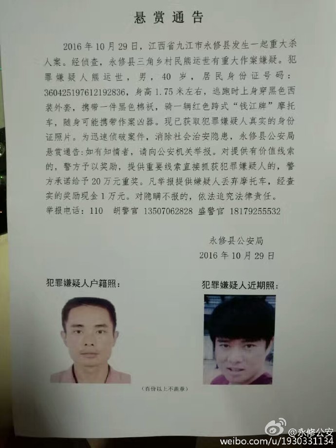 通报显示,经过侦查,永修县三角乡村民熊运世有重大作案嫌疑。熊运世,男,40岁,逃跑时上身穿黑色西装外套,携带一件黑色棉袄,骑一辆红色跨式“钱江牌”摩托车。警方提示熊运世随身可能携带作案凶器。永修县公安局表示,对于提供有价值线索的,警方予以奖励,提供重要线索直接抓获犯罪嫌疑人的,承诺给予5万元奖励。对于隐瞒不报的,将会依法追究法律责任。