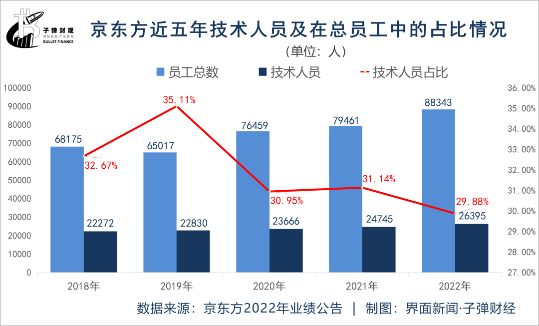「界面新闻·子弹财经」从京东方年报获悉,截至2022年末,京东方员工人数约8.83万人,同比增长11.18%。