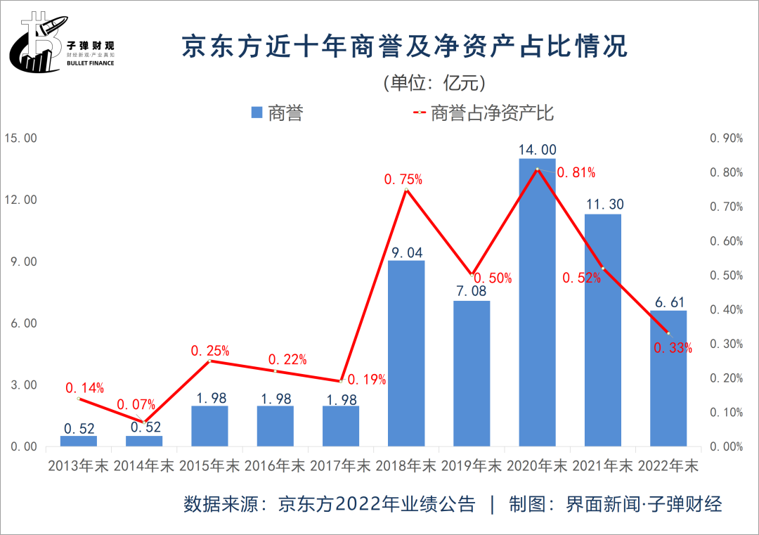 此后便出现了明显回落,在2022年末,京东方的商誉占净资产的比重下跌至0.33%。