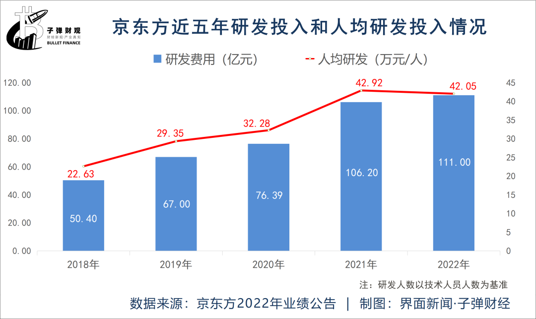 「界面新闻·子弹财经」从京东方的年报发现,2022年京东方的研发投入约111.00亿元,同比增长4.52%。技术人员的增速高于研发投入的增速,人均研发投入必然会出现下滑。这也就是意味着,在同等的研发效率下,京东方的研发强度已出现有明显的减弱。