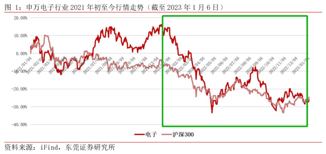 东莞证券研报显示,申万电子行业近两年的行情走势,也由2021年的震荡转为2022年下跌。