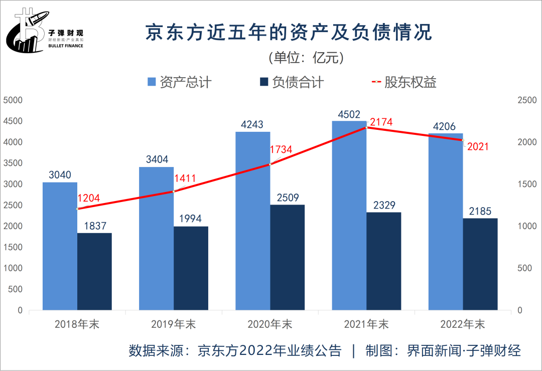 「界面新闻·子弹财经」从京东方近五年的年报发现,截至2022年末,京东方的总资产约4206亿元,同比下降了6.57%,从长远看也是近十年来的首次下降。