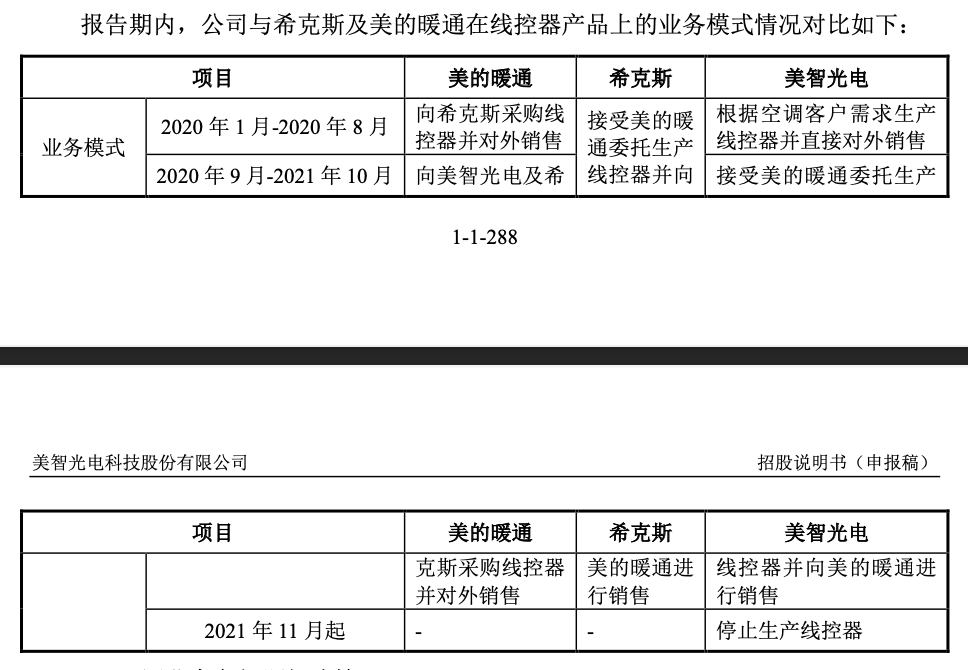 美智光电与美的集团全资子公司美的暖通及美的暖通控股子公司希克斯均从事线控器生产,为解决同业竞争,美智光电于2021年11月起停止生产线控器。
