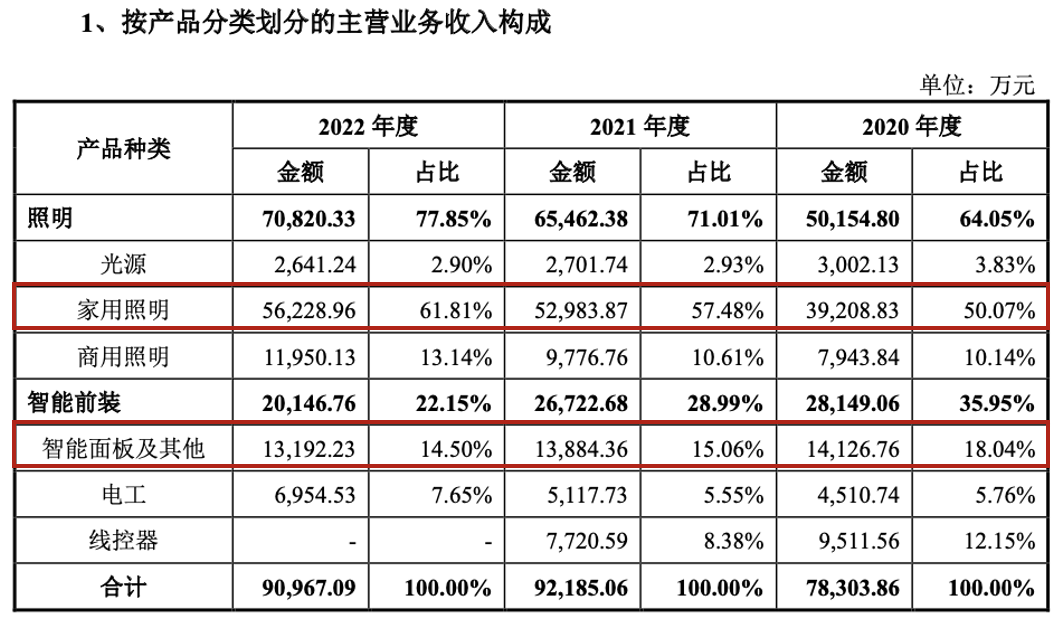 从细分产品来看,报告期内照明产品收入保持快速增长,尤其是家用照明贡献力度由2019年的3.92亿元提高至2022年的5.62亿元,而智能前装业务整体下滑,其中智能面板及其他略微下滑,而线控器业务在2022年停产。