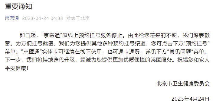 京医通官微4月24日消息,即日起,“京医通”原线上预约挂号服务停止。为方便挂号就医,将为用户提供其他多种预约挂号渠道,可点击“预约挂号”菜单。“京医通”实体卡可继续在线下使用,也可退卡退费,详见“常见问题”菜单。下一步,将持续迭代升级。