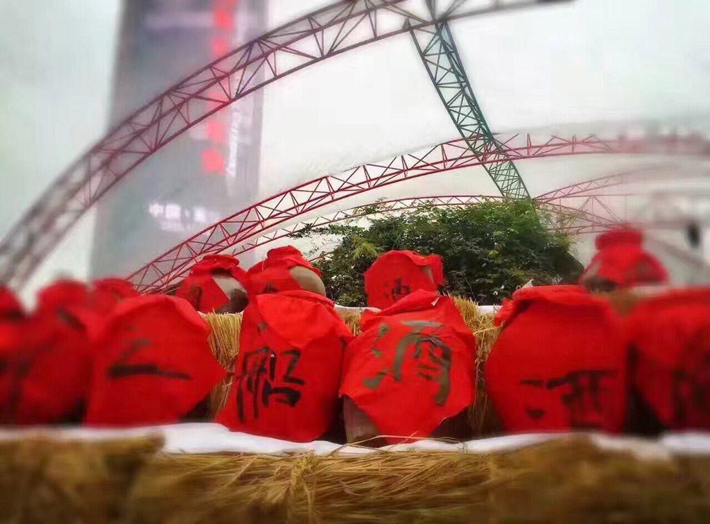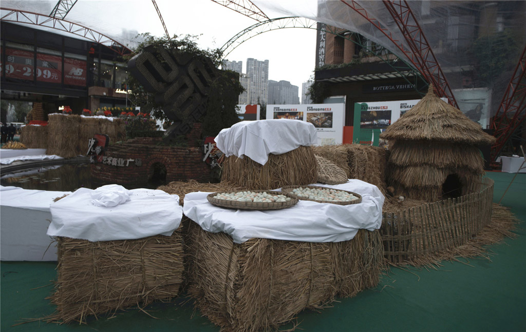 商场进门处,是一大堆稻草垛子圈成的墙体,广场中央,是传统农村为了庆祝五谷丰登而放上去的酒坛子;广场中央,是以农村寻常可见的一些景观造型,比如鸡窝、草垛子之类。