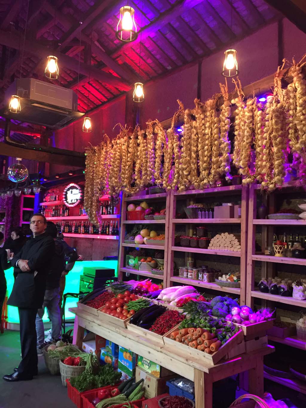 在商场的休息区,这里的酒吧外形是个传统的农家四合院,墙壁周围挂满了成熟的玉米棒子、红辣椒和大蒜串,建筑风格也是传统的木质结构,但是一进入室内,就跟普通酒吧无异,这里可以买到来自任何一个国家的啤酒、红酒、香槟以及咖啡和各类软饮,里面的服务员会介绍这些饮品和产地。