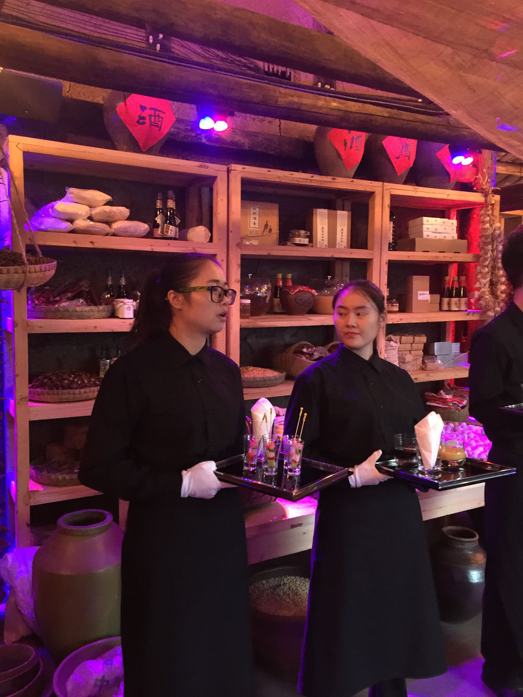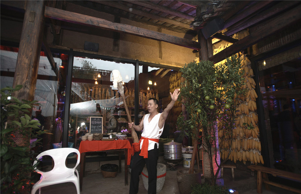 在这家“酒吧”现场,前来逛商场的客人们在挂满玉米棒子、红辣椒以及大蒜串的休闲区穿梭,有的客人一边品尝着重庆农家自酿的低度米酒,一边品尝着西式糕点;有的则一边品尝着鸡尾酒,一边吃着重庆的石磨豆花……