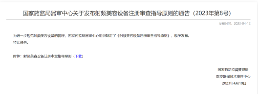 最近,国家药品监督管理局医疗器械技术审评中心发布《射频美容设备注册审查指导原则》(下文简称《指导原则》),对射频美容设备产品注册要点做了详细说明。同时,《指导原则》内容中明确规定,自2024年4月1日起,射频治疗仪、射频皮肤治疗仪之类产品未依法取得医疗器械注册证不得生产、进口和销售。