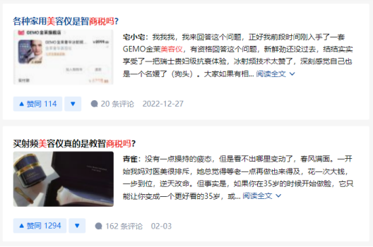 由于大部分美容仪需要长期坚持使用,所以在小红书、知乎、B站等社交平台上,关于“美容仪是不是智商税”等相关问题的讨论层出不穷。