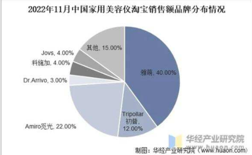 华经产业研究院数据显示,2022年11月美容仪淘宝销售额品牌分布中,雅萌的占比达到40%,其次是Amiro和Tripollar,占比分别为22%、12%,而Jovs、科施加、Dr.Arrivo也分别占据了4%、4%和3%。这其中,仅有Amiro一家是中国品牌,其他都是海外品牌。