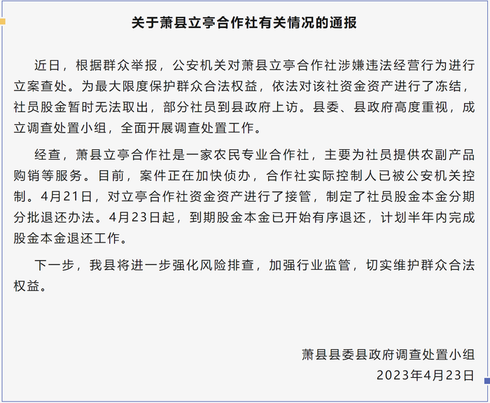 经查,萧县立亭合作社是一家农民专业合作社,主要为社员提供农副产品购销等服务。目前,案件正在加快侦办,合作社实际控制人已被公安机关控制。4月21日,对立亭合作社资金资产进行了接管,制定了社员股金本金分期分批退还办法。4月23日起,到期股金本金已开始有序退还,计划半年内完成股金本金退还工作。