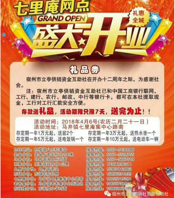 另外,一篇发布于2018年3月的文章《热烈祝贺宿州市立亭资金互助社七里庵分社2018年4月6日隆重开业》提到,“宿州市立亭供销资金互助社在开办十二周年之际,为感谢社会,存款送礼品”,同时介绍道“宿州市立亭供销资金互助社已和中国工商银行联网,工行、建行、农行、邮政、中行等银行卡,都可在本社提取现金,工行对工行汇款安全方便。”