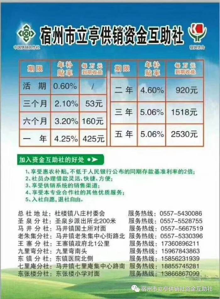 不仅如此,该公众号还曾发布文章介绍了在宿州市立亭供销资金互助社存款的利率,指出加入资金互助社的好处包括“享受惠农补贴,不低于人民银行公布的同期存款基准利率的2倍”。图片数据显示,该合作社活期存款年补贴率0.6%;一年期年补贴率4.25%,每万元到期收益425元;三年期为5.06%,每万元到期收益1518元;五年期为5.06%,每万元到期收益2530元。