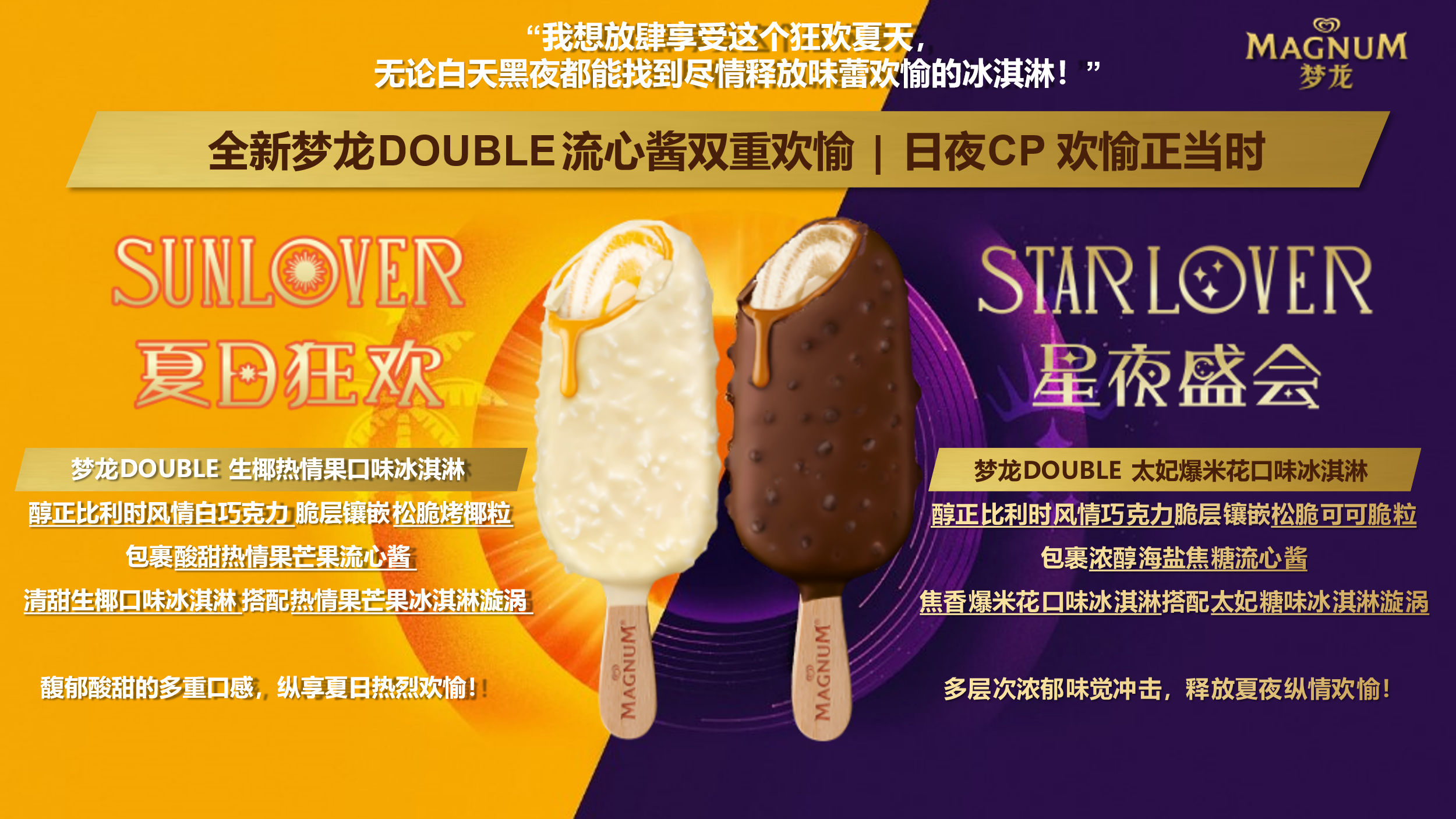 此次品牌焕新,梦龙带来两款全新DOUBLE流心酱日夜组合冰淇淋 ——梦龙DOUBLE太妃爆米花口味冰淇淋以及梦龙DOUBLE生椰热情果口味冰淇淋,黑夜与白天的碰撞与冲击,点燃炎炎夏日下躁动的味蕾。