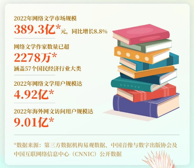 4月10日,《2022中国网络文学发展研究报告》显示,2022年网络文学市场规模达389.3亿元,同比实现了8.8%的高速增长。