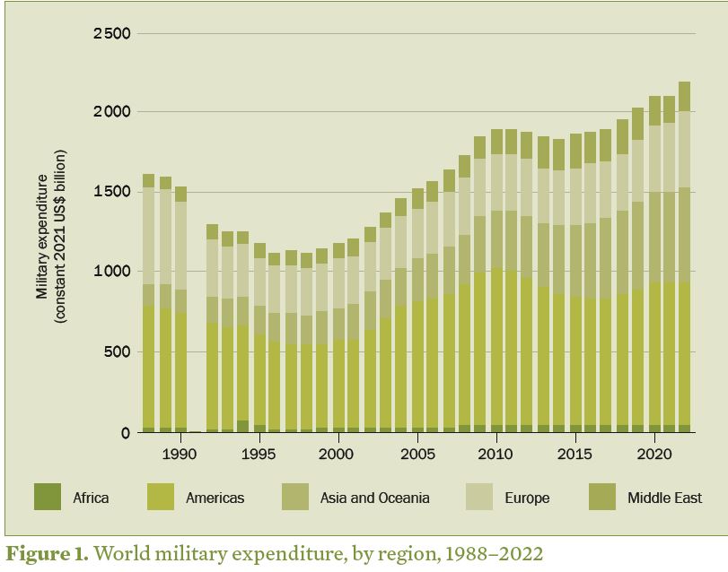 2022年,全球军费开支升至2.24万亿美元,创下有记录以来最高。俄乌冲突让欧洲成为了军备热点地区。欧洲军费支出增幅为各地区中最高,中欧和西欧国家军费达到了冷战结束以来最高。