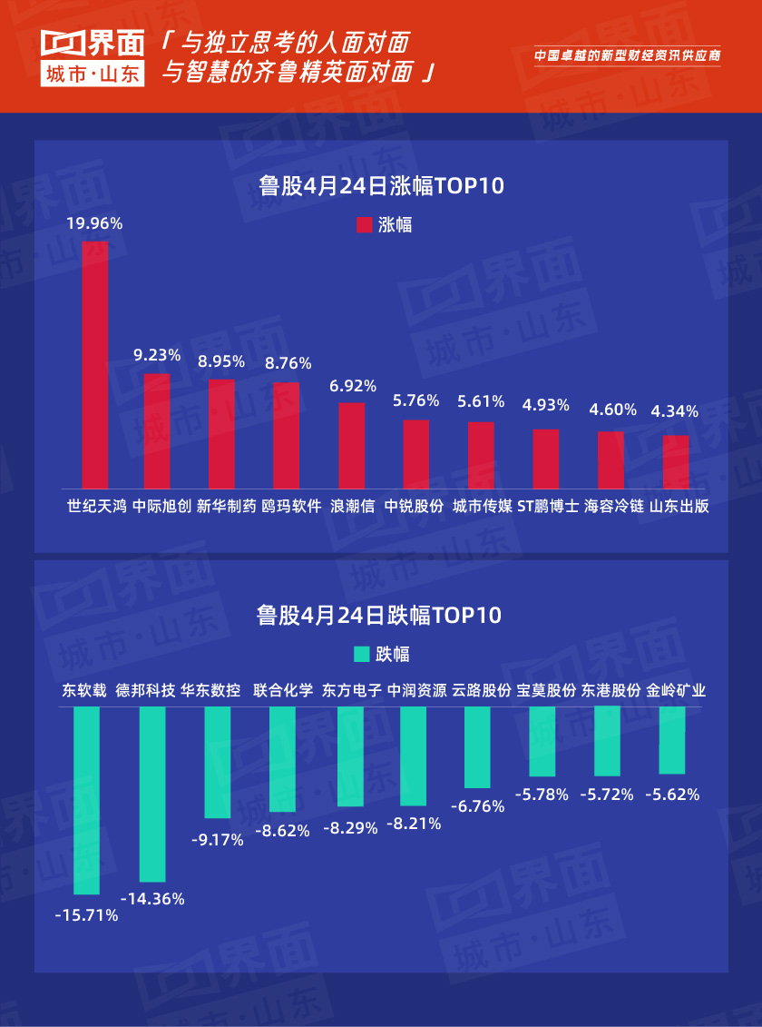 4月24日,山东省内沪深股票有127只个股上涨,155只个股下跌;总市值过千亿的有万华化学(600309)、海尔智家(600690)、 兖矿能源(600188)、青岛啤酒(600600)、中航沈飞(600760)、山东黄金(600547)共6家,500亿-1000亿的共有7家,分别是潍柴动力(000338)、 浪潮信息(000977)、 中际旭创(300308)、 华鲁恒升(600426)、歌尔股份(002241)、华电国际(600027) 中泰证券(600918) 。