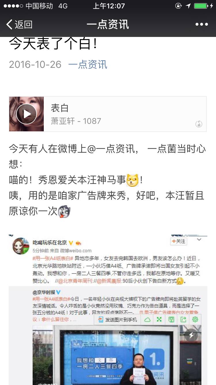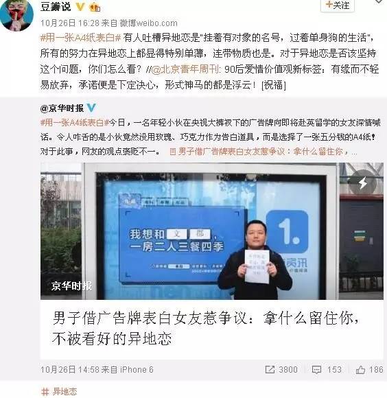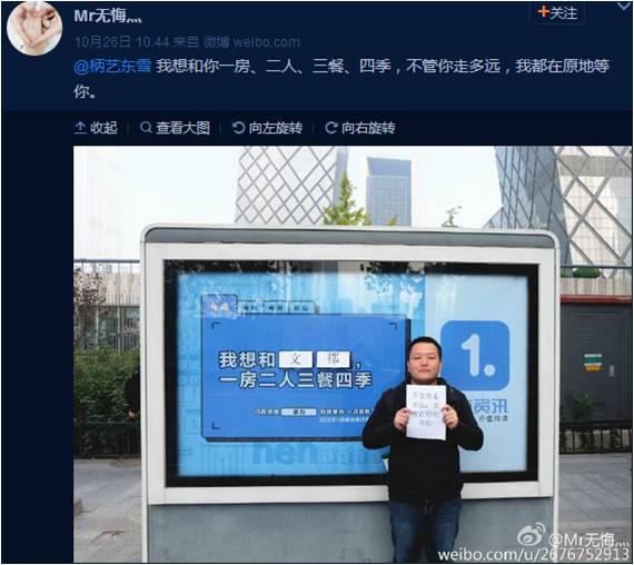 无论是该男子的微博图文及视频,都是在一点资讯广告牌前,而不是在其他广告牌。另外告白文字“我想和文郡,一房二人三餐四季”,刚巧套用了一点资讯广告内容“我想和1.1.,一房二人三餐四季”,一字不差,实属巧合的太巧合。