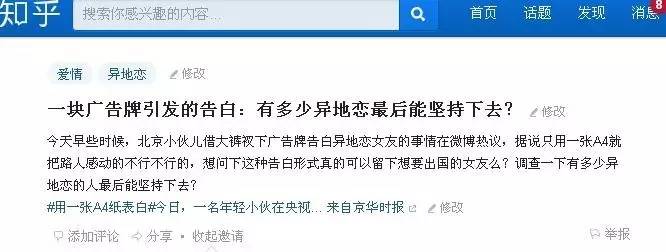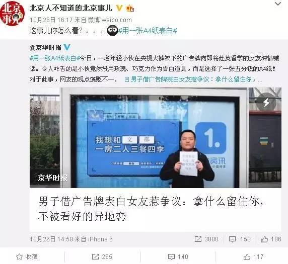 这几天,一位90后男子借助北京光华路附近的一块广告牌向即将赴欧留学的女友深情告白,并因独特的告白方式蹿红网络。微博网络截图可见,小伙利用一块写有“我想和XX,一房二人三餐四季”文案的广告牌,将A4纸打印出女友名字贴在了打码位置。此举在解锁花式告白新姿势的同时,也引发网友对90后爱情价值观“5毛钱A4纸告白”的辩论和热议。