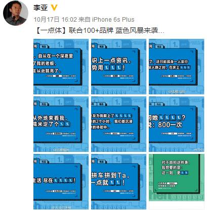 其实早在本次事件之前,10月中旬以来,一点资讯就展开了有史以来最大规模的品牌推广Campaign。从报纸到两微一端一站,再到地铁,铺天盖地的“1.”广告,以及联合100家品牌发动的“蓝色风暴”,同时,包括杨石头在内的众多公关营销专家和KOL,纷纷撰文解读及朋友圈晒图,一时刷屏,引发热议。