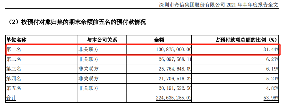 巧合的是,*ST奇信2021年半年报中“按预付对象归集的期末余额前五名的预付款情况”显示,第一名的预付款金额正是1.31亿元,占预付款项总额的比例为31.44%。当时*ST奇信称该“第一名”为非关联方。