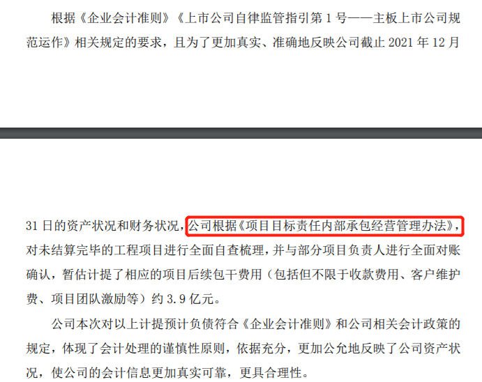 另外,已支付的项目后续包干费用9.56 亿元对应的项目,并非全部为2021 年的项目。暂估计提的 3.9 亿元是预计后续还需要与内部承包人结算的包干费用,将其计入 2021年管理费用是谨慎、合规的,并已进行披露。