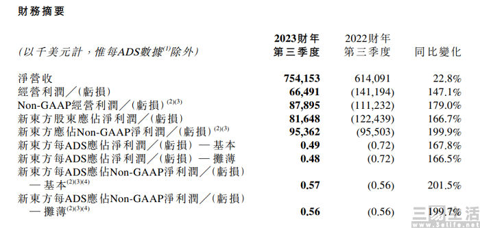 4月19日晚间,新东方公布了截至2023年2月28日的2023财年第三财度未经审核财报。其中显示,该财季其营收同比上升22.8%、至7.54亿美元,超出了此前预计7.03-7.2亿美元的指引区间,经营利润同比上升147.1%、至6650万美元,归母净利润也同比上升166.7%、至8165万美元。