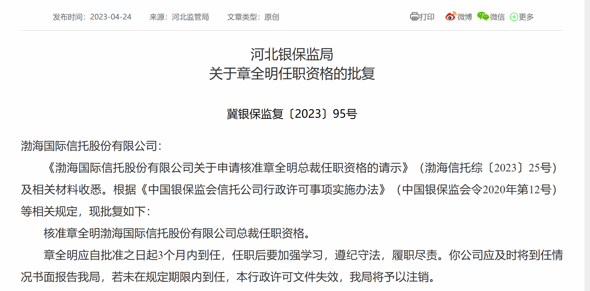 4月24日,银保监会河北监管局发布公告,核准章全明渤海国际信托股份有限公司(下称:渤海信托)总裁任职资格,批复时间为2023年4月23日。